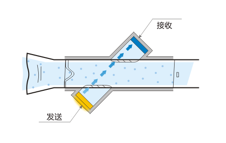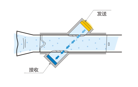 超声波时差法是利用一对超声波换能器相向交替(或同时)收发超声波,通过观测超声波在介质(气体或液体)中的顺流和逆流的传播时间差来间接测量流体的流速,再通过流速来计算流量的一种间接测量方法。超声波原理的流量测量仅取决于流量和几何形状,不依赖于温度,气体成分,湿度或压力。